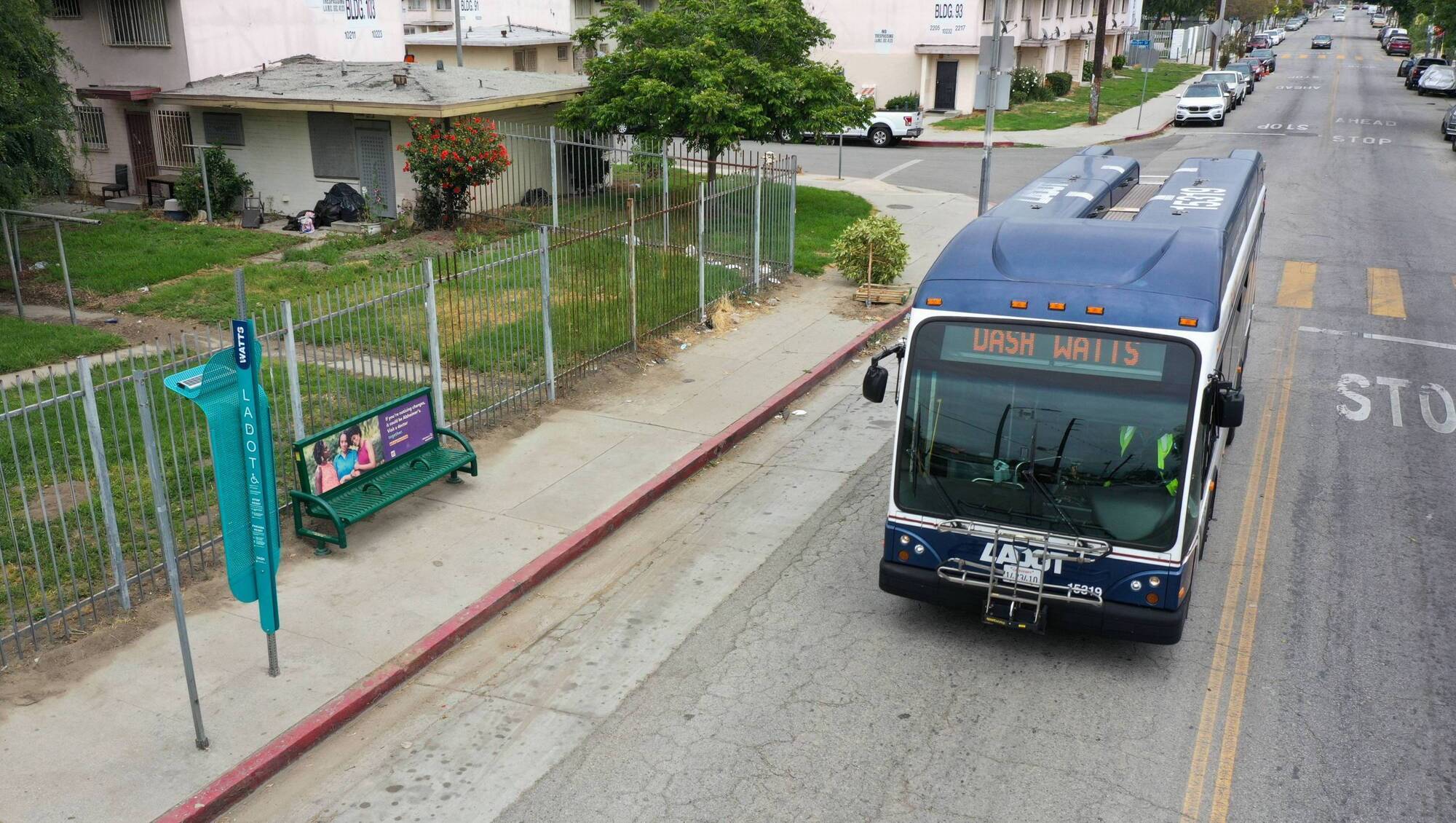 A DASH bus travelling through the Watts neighborhood of Los Angeles, California. According to the most recent U.S. Census Bureau, just 3.1% of American adults used public transport to get to work. Picture: AFP via Getty Images