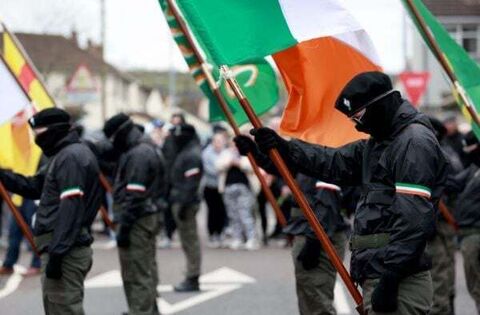There was a colour party made up of people wearing face coverings, sunglasses and paramilitary-style dress, carrying the Irish flag and a host of republican flags.