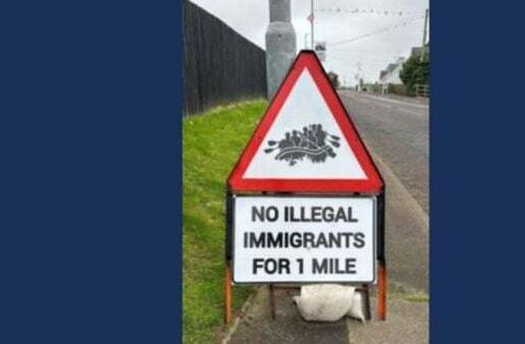 The sign, which carried the message “no illegal immigrants for one mile” with an image of a number of people in a small boat, was visible on the footpath in Moygashel on Monday.
