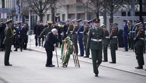 Army personnel and the brass and pipe bands lined up outside the capital’s iconic GPO building on O’Connell Street for the ceremony, which involved an army flyover and the president laying a wreath for those who had died.