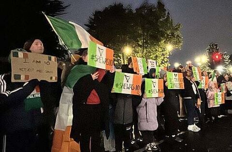 People gathered at Citywest Hotel in Saggart, holding banners in the colours of the Irish flag which read “she was 10”, and let off pink smoke.