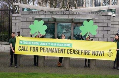 Activists from Amnesty gathered at US diplomatic offices in Dublin and Belfast on Friday morning holding banners that read: “President Biden, listen to your Irish roots and demand a permanent ceasefire.”