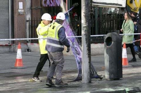 The clean-up is continuing on Dublin’s thoroughfare O’Connell Street, with burned-out Luas tram carriages lifted off the track by cranes and broken glass and missiles swept away.