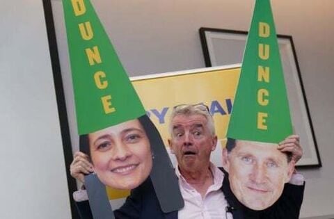 Mr O’Leary, one of Ireland’s wealthiest businessmen, posed for photos holding cut-outs of the two ministers wearing green dunce caps.