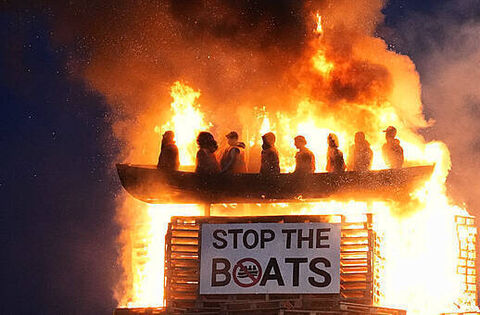 The boat on top of the pyre contained more than a dozen life-sized mannequins wearing life jackets, while below it were placards saying “stop the boats” and “veterans before refugees”.
