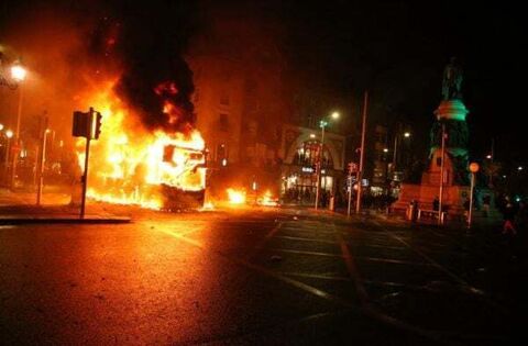 The Luas is in flames near The Gresham Hotel, while the bus is at the bottom of O'Connell Street.