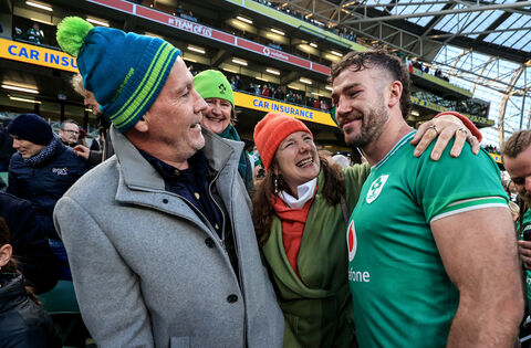 Caelan Doris with his parents Chris and Rachel after Sunday's Six Nations win over Italy at the Aviva Stadium. Pictures: INPHO/Dan Sheridan