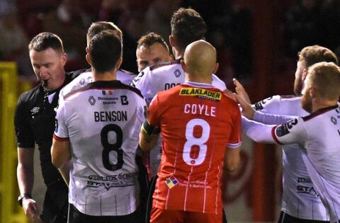 Well-known Mayo referee Damien McGrath loses his yellow card as tempers flare between players during last month's SSE Airtricity League Premier Division match between Shelbourne and Dundalk at Tolka Park. Picture: INPHO/Ciaran Culligan