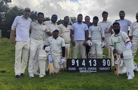 The visitors won the toss and elected to bat first. They found the going tough, especially when Pavittar Rathaur took out their top order with another fine bowling effort of four wickets for 36 runs. Before the match started there was much interest in the 5th test at the Oval, players watching with intent on their phones the final thrilling moments.