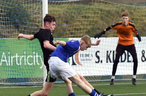 Balla’s Ryan Judge has his effort blocked during the FAI Schools National Senior B soccer final at Athlone Town AFC. Picture: David Farrell Photography