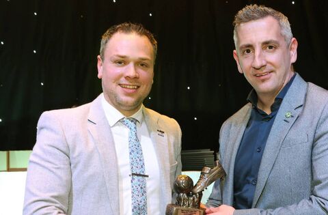 Alan Plunkett of Ballyglass FC was presented with the Westaro Masters Division 2 Golden Boot award by Walter Holleran, the FAI's Head of Grant Funding and Infrastructure Development, at the Mayo Football League's presentation dinner at the Castlecourt Hotel in Westport. Pictures: Michael Donnelly