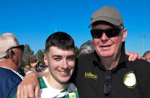 Castlebar Celtic's Brian Walsh, left, pictured with club legend and Mayo league Hall of Fame recipient Pat Gavin after the club's Connacht Cup win. Picture: John Corless
