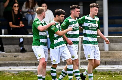 Eoghan Hughes of Castlebar Celtic, second from right, celebrates with team-mates Ben Murphy, Johnnie Cocozza and Fionn Mahon after scoring their side's first goal during the Sports Direct Men's FAI Cup first round match between North End United and Castlebar Celtic at Hollygrove Townparks in Wexford. Picture:Tyler Miller/Sportsfile