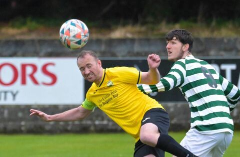 Castlebar Celtic captain Ioseph O’Reilly (left), wearing the club's away kit, holding off Jason Devaney of Sligo's Strand Celtic in October's 2024/25 Connacht Cup tie. Picture: John Corless