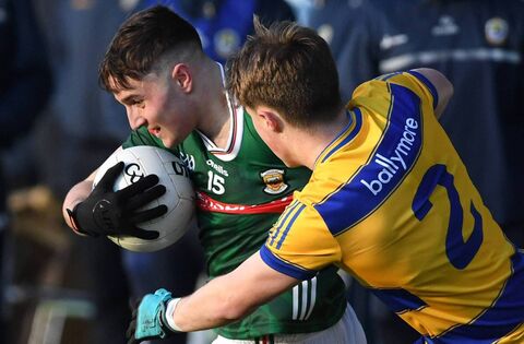 Mayo’s Tom Lydon breaks away from Roscommon’s Diarmuid O’Higgins. Picture: David Farrell Photography