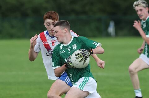 Dylan Pilcher of Charlestown Sarsfields takes on John Jennings, the vice captain of St Jarlath's, in last Thursday's final of the East Mayo U16 'A' football championship. Picture: Michael Donnelly