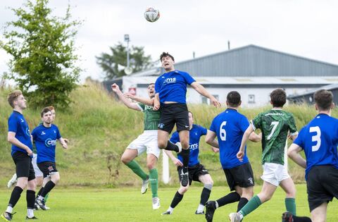 Tussle for the ball: action from last Sunday's Super League encounter between Claremorris and Kiltimagh/Knock United. Picture: John Corless