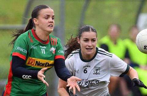 Carnacon’s Amy Dowling and Charlestown's Ella Brennan follow the flight of the ball.