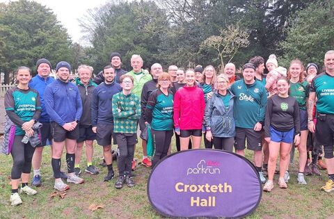 Paula Donnellan Walsh, front centre, with the crew form the Liverpool Irish Rovers running club at the Croxeth Parkrun.