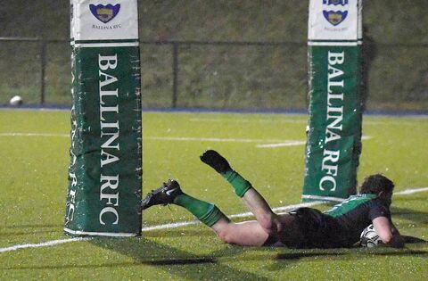 Ballina’s Daniel Feeney scores his side’s second try against Ballinasloe during the Bank of Ireland Connacht J1A League played in atrocious weather conditions at Heffernan Park last Saturday night. Picture: David Farrell Photography