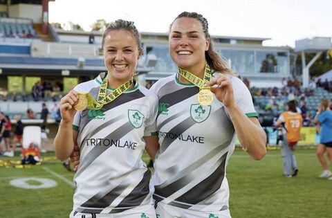Connacht's Aoibheann Reilly and Beibhinn Parsons celebrate the Ireland Women’s Rugby Sevens team's recent success in Perth. Both players will start for Ireland tomorrow in their Guinness Women's Six Nations clash against France.