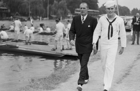 Jack Kelly Sr (left) with his son Jack Kelly Jr at Henley Royal Regatta, Oxfordshire, on July 3, 1946. Kelly Sr had been denied entry to the regatta 26 years earlier before going onto become a triple Olympic champion. Kelly Jr would himself compete at four Olympic Games. Picture: Keystone/Hulton Archive/Getty Images