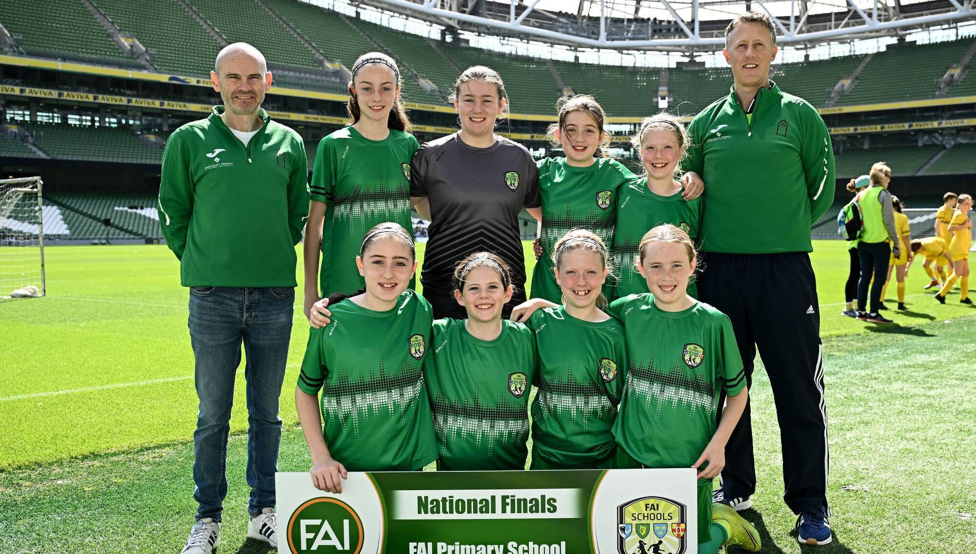 The Lankill NS team from Aughagower, Westport, who took part in the FAI Primary 5s Finals Day at the Aviva Stadium in Dublin. Included are players Shona Gibbons, Sophie Collins, Karla Gibbons, Aine Hughes, Abbie Collins, Jennifer McGuire, Róisín O'Malley and Holly Vahey, and teachers Pat Morrison and Ciarán Hynes. Picture: Seb Daly/Sportsfile