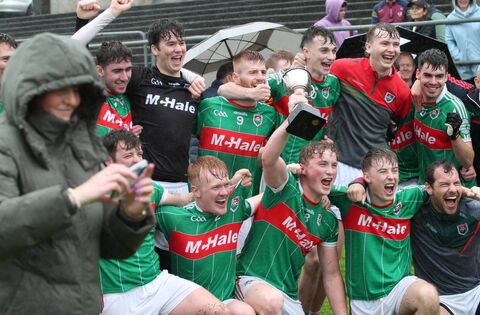 The Kilmaine team celebrate their against-the-odds win against Ballinrobe in last Sunday's Division 4 final in Hollymount. The winners had two players sent-off in the first-half. Pictures: Andy Walsh