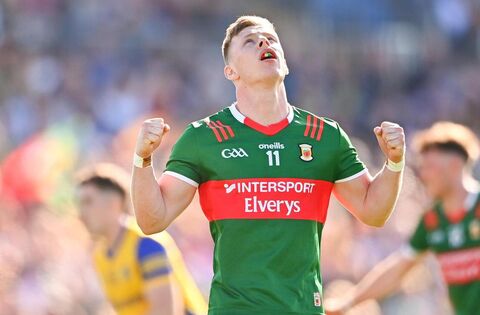 1 June 2024; Ryan O'Donoghue of Mayo celebrates after scoring his side's first goal during the GAA Football All-Ireland Senior Championship Round 2 match between Roscommon and Mayo at Dr Hyde Park in Roscommon. Photo by Ben McShane/Sportsfile