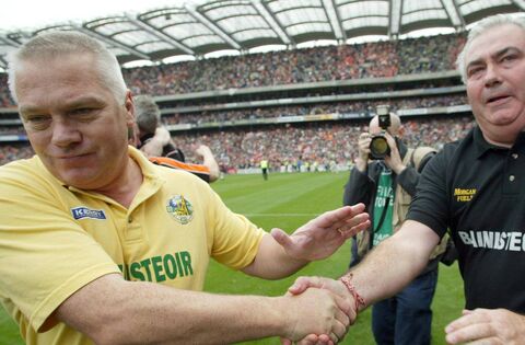 Joe Kernan is congratulated by Paidí O Sé following the 2002 All-Ireland SFC Final between Armagh and Kerry. Both men have links to their counties recent successes Picture: INPHO/Morgan Treacy