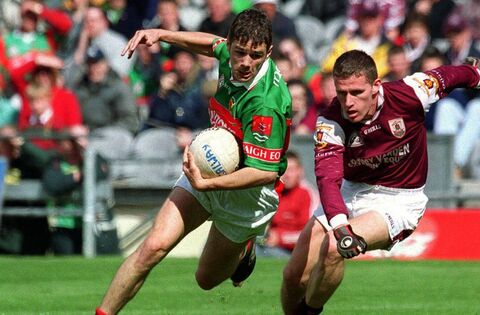 Mayo's James Gill goes past Sean de Paor of Galway during the 2001 National Football Division 1 final. The rivals clash next weekend in the opening round of the 2024 campaign. Picture: INPHO/Patrick Bolger