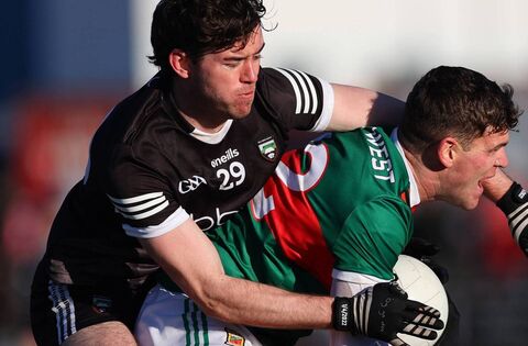 Jordan Flynn of Mayo holds off Sligo's Luke Towey in a previous encounter between the neighbours. Picture: INPHO/James Crombie