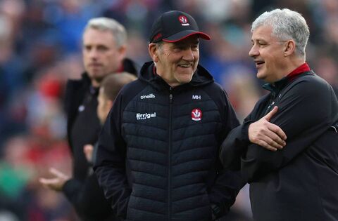 Happier times: The now former Mayo manager Kevin McStay with the then Derry manager Mickey Harte at last year's All-Ireland SFC preliminary quarter-final between the counties at Hastings MacHale Park, Castlebar. Picture: INPHO/James Crombie