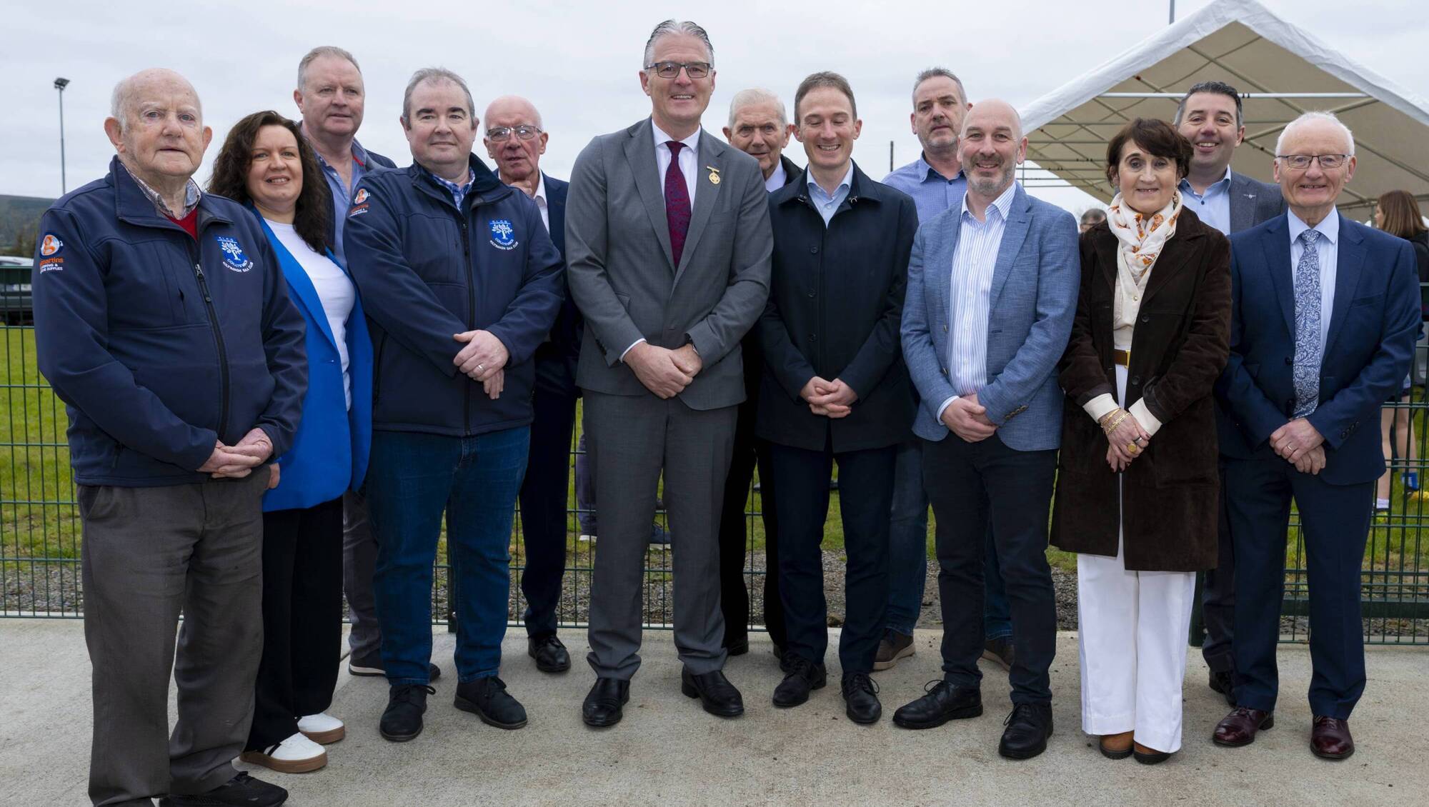 GAA President Jarlath Burns and Minister Alan Dillon TD with Kiltimagh GAA club officers at last Saturday morning's official opening of the club's redeveloped Joseph Gilmartin Memorial Park. It was a case of double the delight for Kiltimagh as later in the day they booked their ticket to the Mayo Junior Football Championship Final with a semi-final victory over Ardagh in Foxford. Picture: John Corless