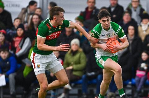 Shay Rafter of London in action against Donnacha McHugh of Mayo during the Connacht FBD League quarter-final at the Connacht GAA Air Dome earlier this year. Just as the year began in defeat for the Mayo senior football team to perceived minnows, it ended with defeat for Mayo football's senior club champions to 11/2 outsiders Coolera-Strandhill of Sligo. Picture: Tyler Miller/Sportsfile