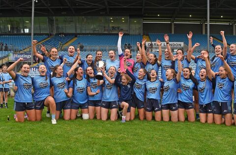 The players of Westport celebrate successfully defending the Mayo LGFA Senior Championship title after their come-from-behind win against Knockmore at Hastings Insurance MacHale Park last Sunday, which completed a league and championship double for the Covies this season. Picture: Conor McKeown