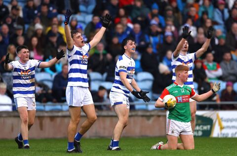 Breaffy’s David Livingstone, Oisin Tunney, Mark Dervan and Conor O'Shea react Ballina full-forward Luke Feeney is awarded a free. Feeney, playing his first season of senior football, was named as the player of the match. Picture: INPHO/James Crombie