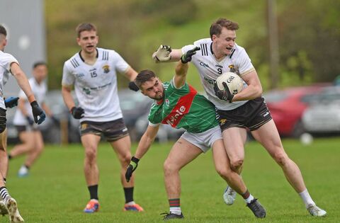 Kilmeena’s Kevin Ryder holds off the challenge of Kilmaine’s Darren Munroe. Picture: Conor McKeown