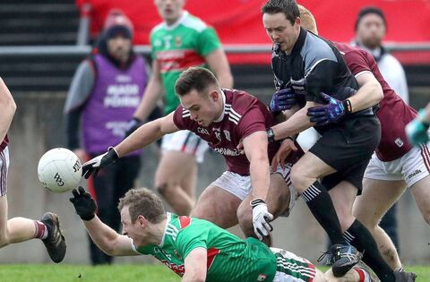 Referee Patrick Neilan gets caught in the middle of Mayo's Colm Boyle and Cillian McDaid and Peter Cooke of Galway during a battle for possession in the 2019 FBD Insurance Connacht SFL at Tuam Stadium. There were few who loved contesting breaking ball more than 'Boyler' for whom the Mayo-Galway rivalry in particular was a special thing. Picture: INPHO/Bryan Keane