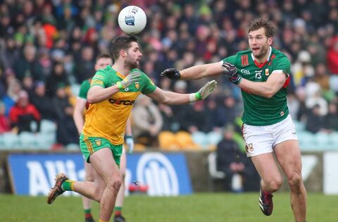 Mayo’s Aidan O'Shea and Donegal’s Brendan McCole in action during the 2023 Allianz National League. Both counties have been on very different trajectories since. Picture: INPHO/Lorcan Doherty