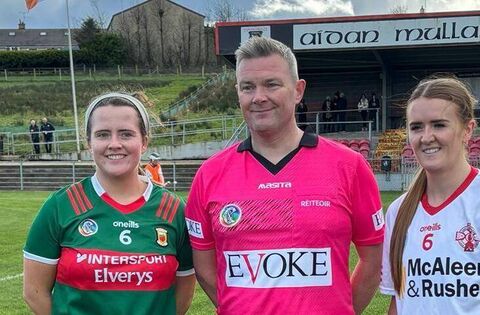 Mayo's Ava Lambert and Tyrone's Una McCann picture with referee Keith Cahill before the game.