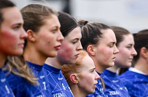 The Claremorris team stand for Amhrán na bhFiann before the Currentaccount.ie All-Ireland Ladies Junior Club Championship semi-final match between Claremorris of Mayo and Lavey of Derry at Canon Gibbons Park, Claremorris. Picture: Harry Murphy/Sportsfile