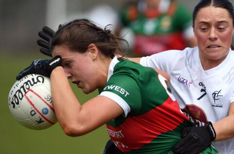 Mayo midfielder Erin Murray staves off the challenge of Kildare’s Lauren Murtagh during the LGFA All-Ireland SFC Riound 2 clash at James Stephens Park, Ballina, last Saturday. Pictures: David Farrell Photography