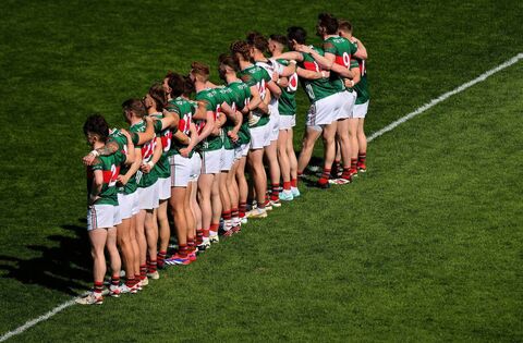 The Mayo team during the national anthem prior to their Connacht SFC final defeat to Galway at Hastings Insurance MacHale Park, Castlebar. Picture: INPHO/Ryan Byrne