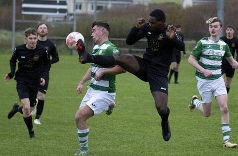 Castlebar Celtic's Eoghan Hughes is challenged by Strand Celtic's Ayomide Olabode. Pictures: John Corless
