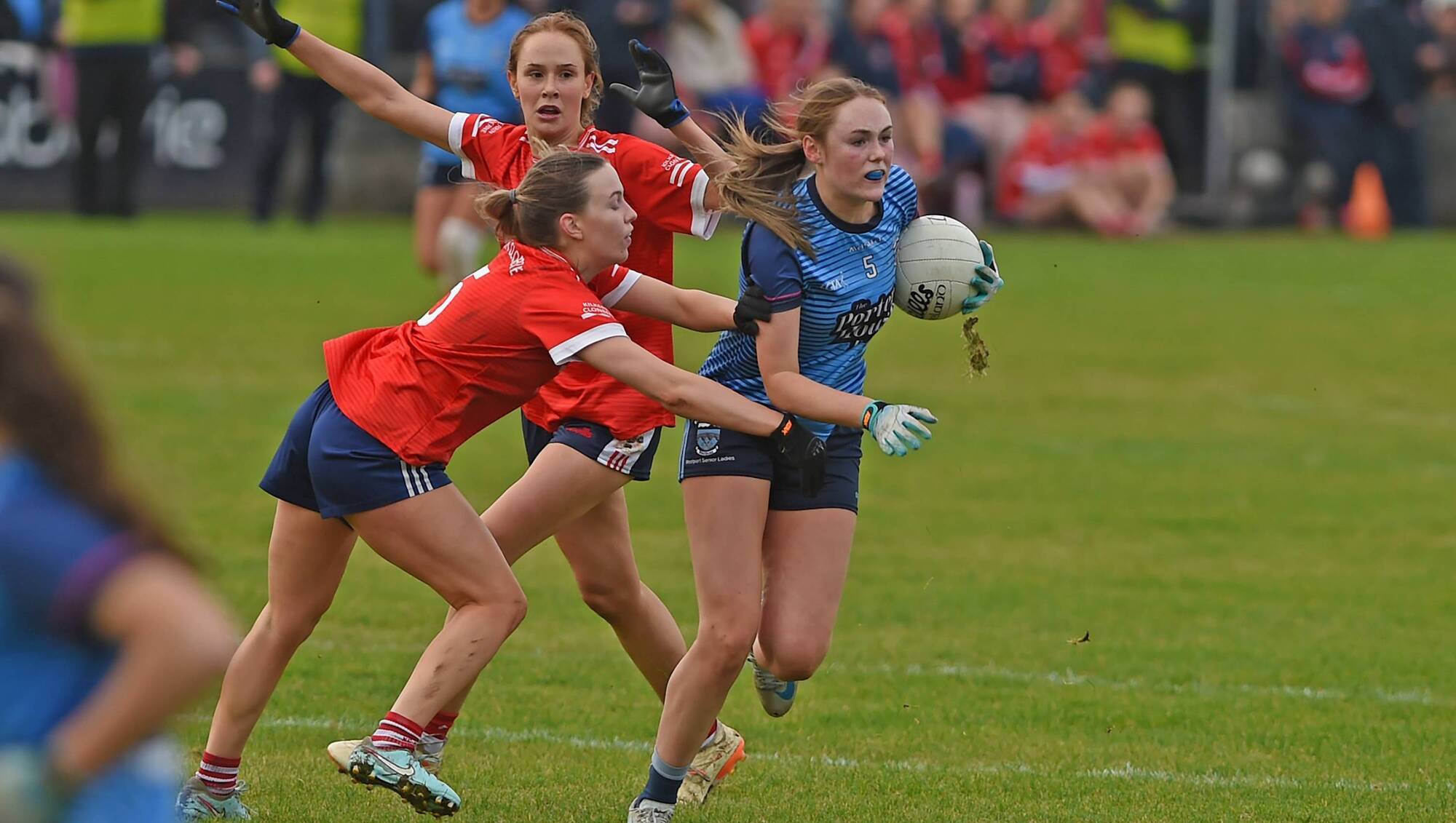 Westport's Sarah Mulroy tries to break past Kilkerrin-Clonberne's Caitlin Boyle.