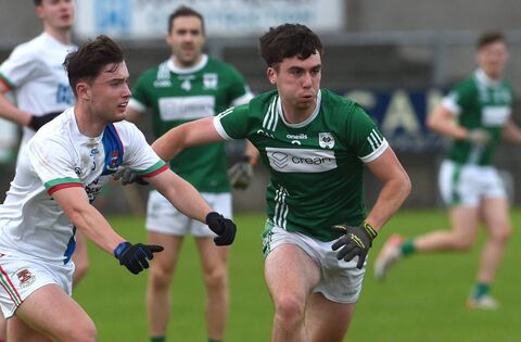 Ballina Stephenites' Ciaran Boland in action against Charlestown's Gareth O'Donnell during the Mayo SFL at James Stephens Park last Saturday evening. Picture: David Farrell Photography