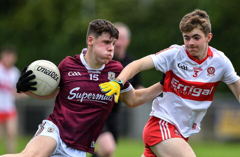 Colm Costello of Galway in action against Eoin Scullion of Derry during the 2022 Electric Ireland GAA All-Ireland Football Minor Championship Semi-Final match between Galway and Derry at Parnell Park, Dublin. Picture: Ray McManus/Sportsfile