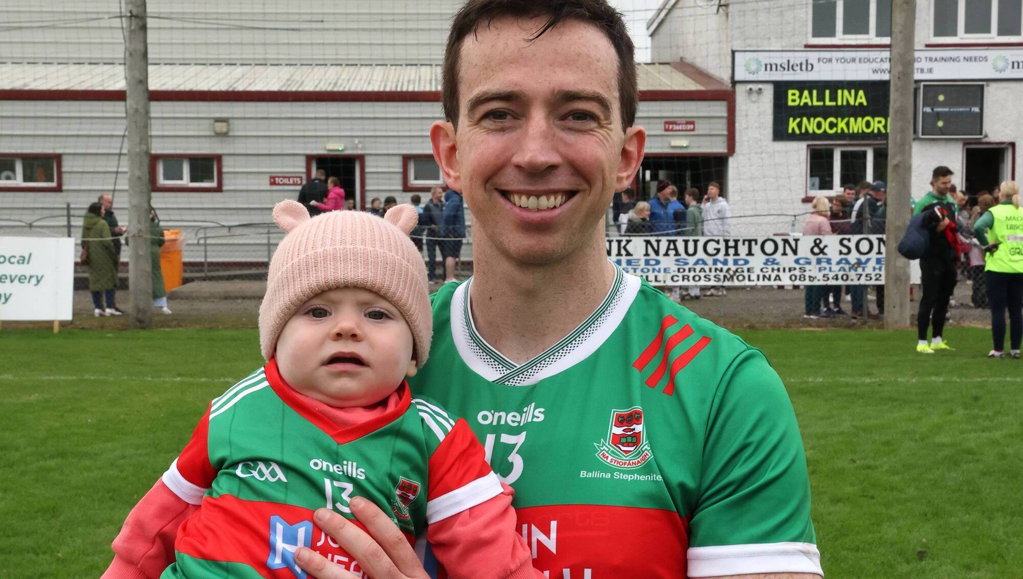 Evan Regan, captain of Ballina Stephenites, with his daughter Eabha after his side's victory over Knockmore last Saturday which has secured the Green and Red a fourth consecutive appearance in the Connacht Gold Mayo SFC Final. Picture: Michael Donnelly