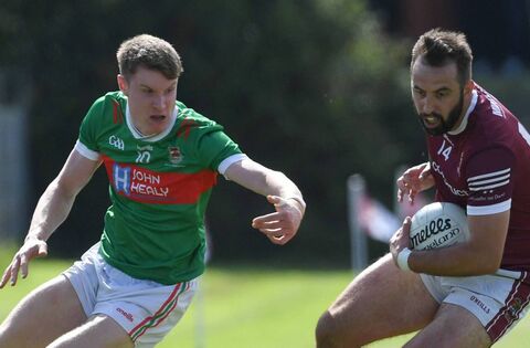 Crossmolina’s Patrick Leddy gathers the ball ahead of Ballina Stephenites Dylan Thornton during the Mayo SFC Round 2 game at St. Tiernan’s GAA Park last Sunday. Pictures: David Farrell Photography